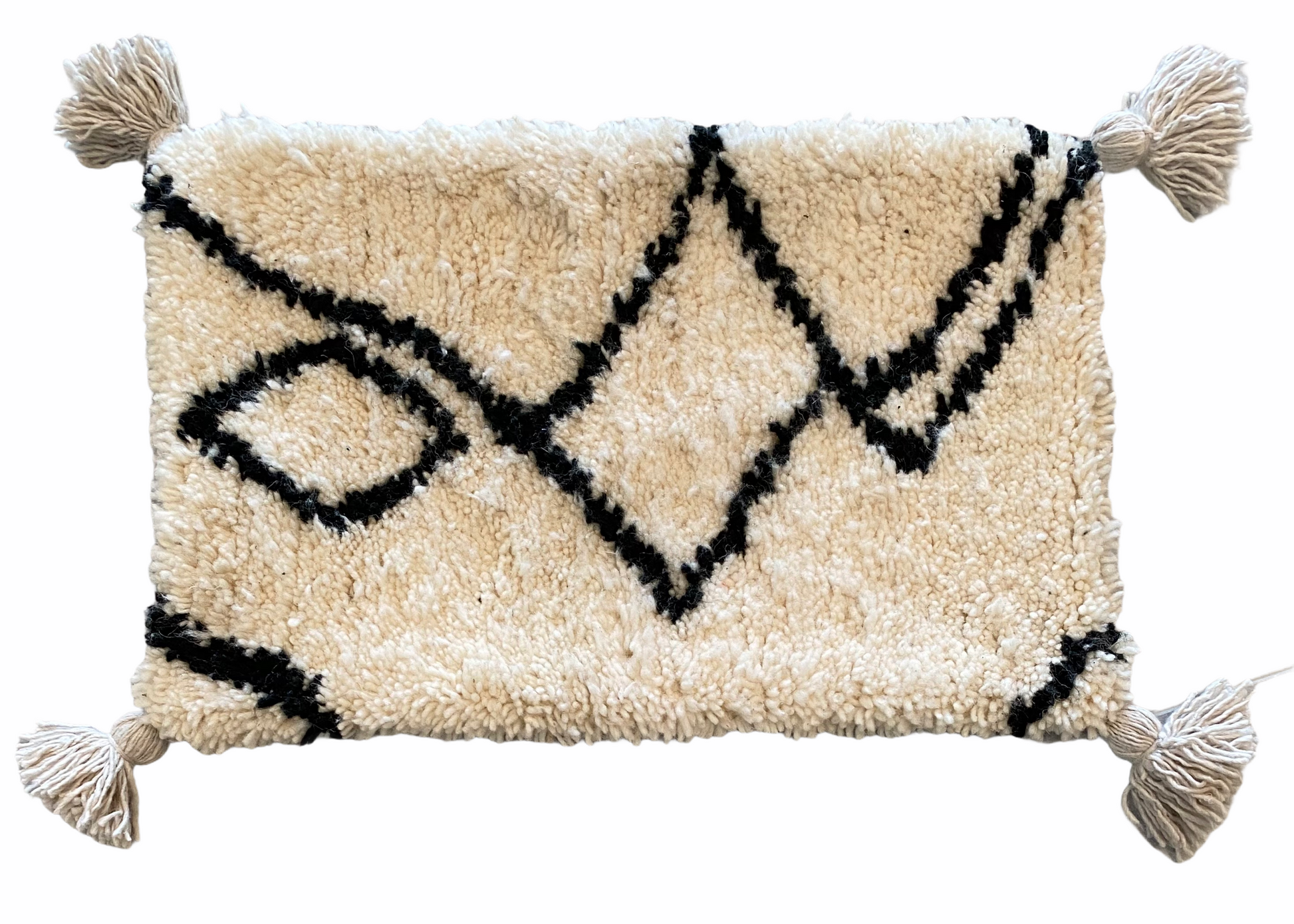 Colour: signature Beni Ourain ~ undyed cream sheep’s wool, with black geometric details. Cream cotton back with cream tassels.