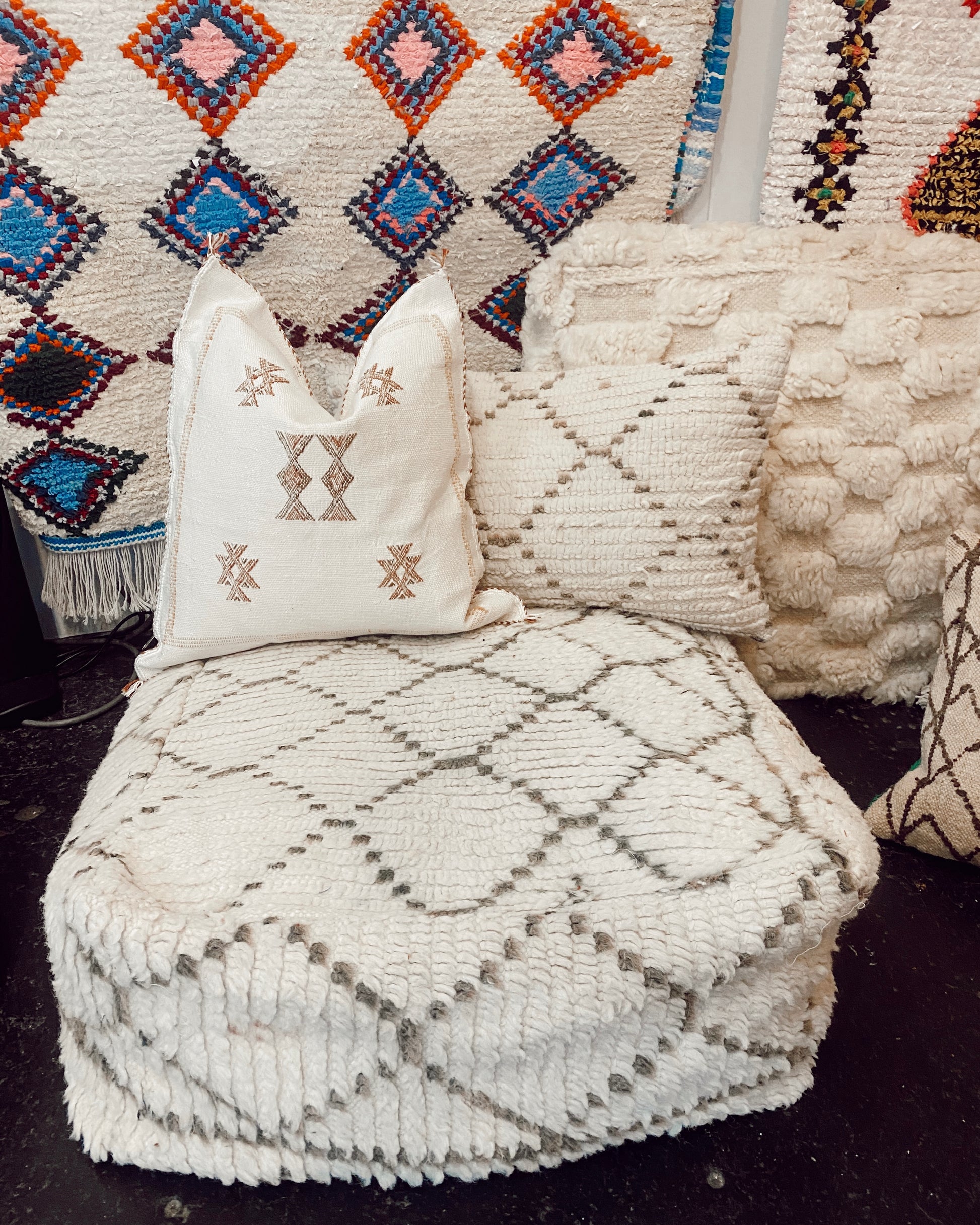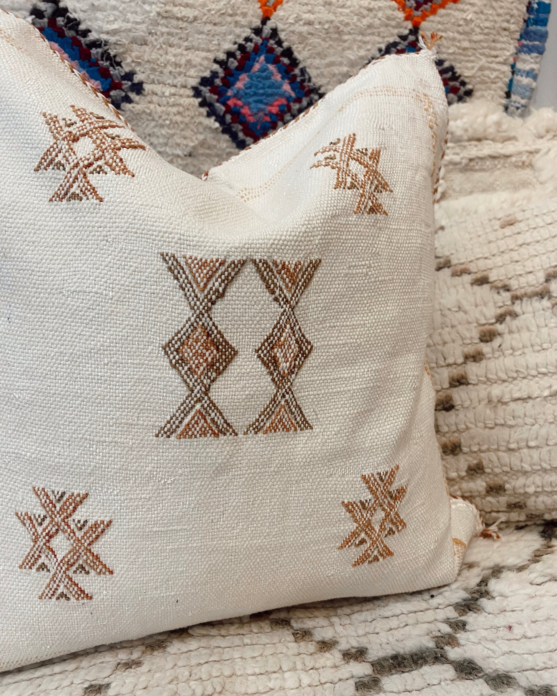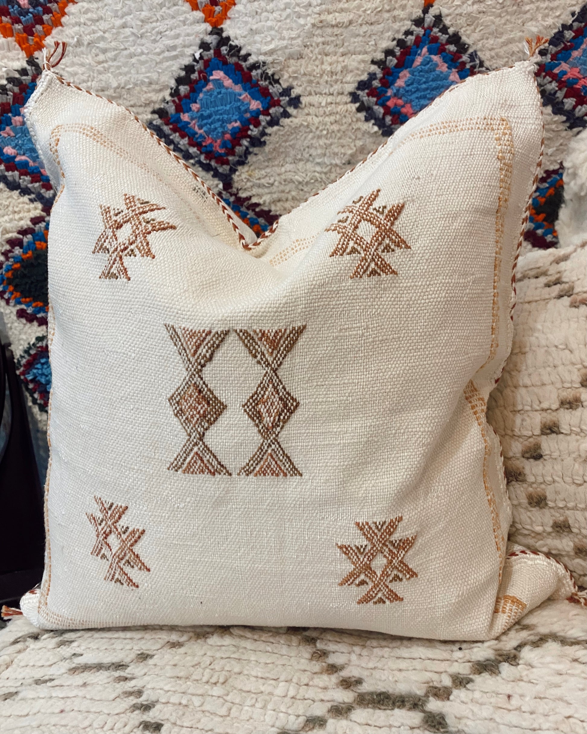 Lovingly remastered from old sabra (cactus) silk rugs, the fabric is coloured with natural dyes, then sun bleached on the rooftops of the medinas to achieve their vintage character and worldly vibe. Intricate detailing makes each piece different to the next.